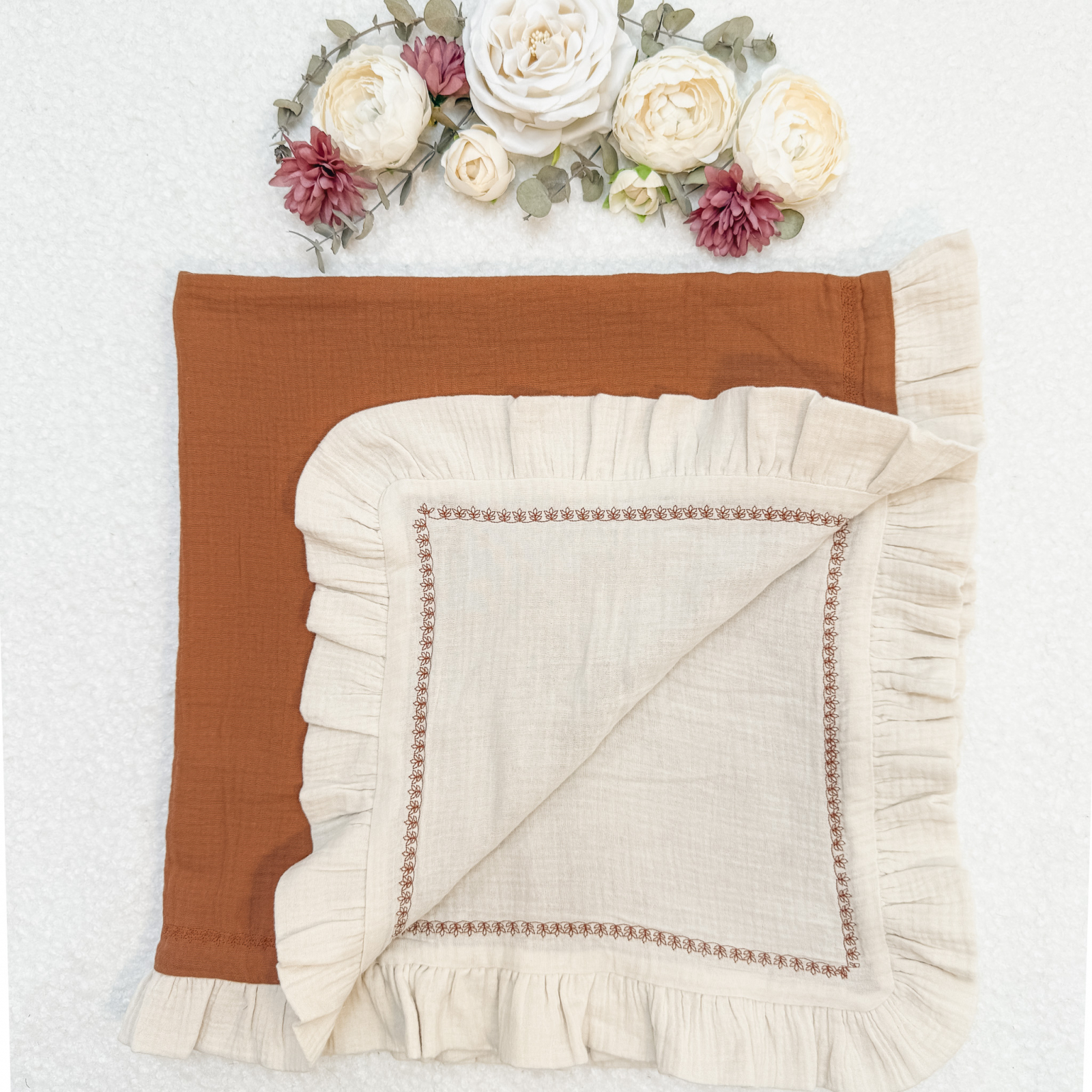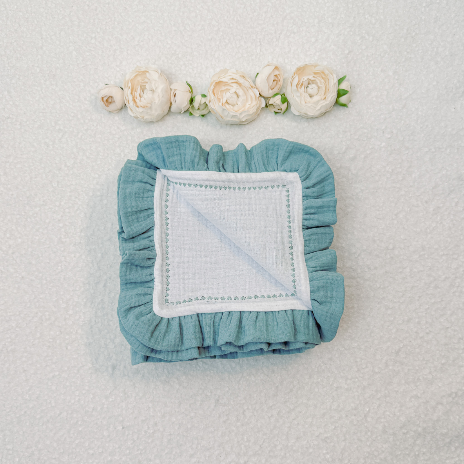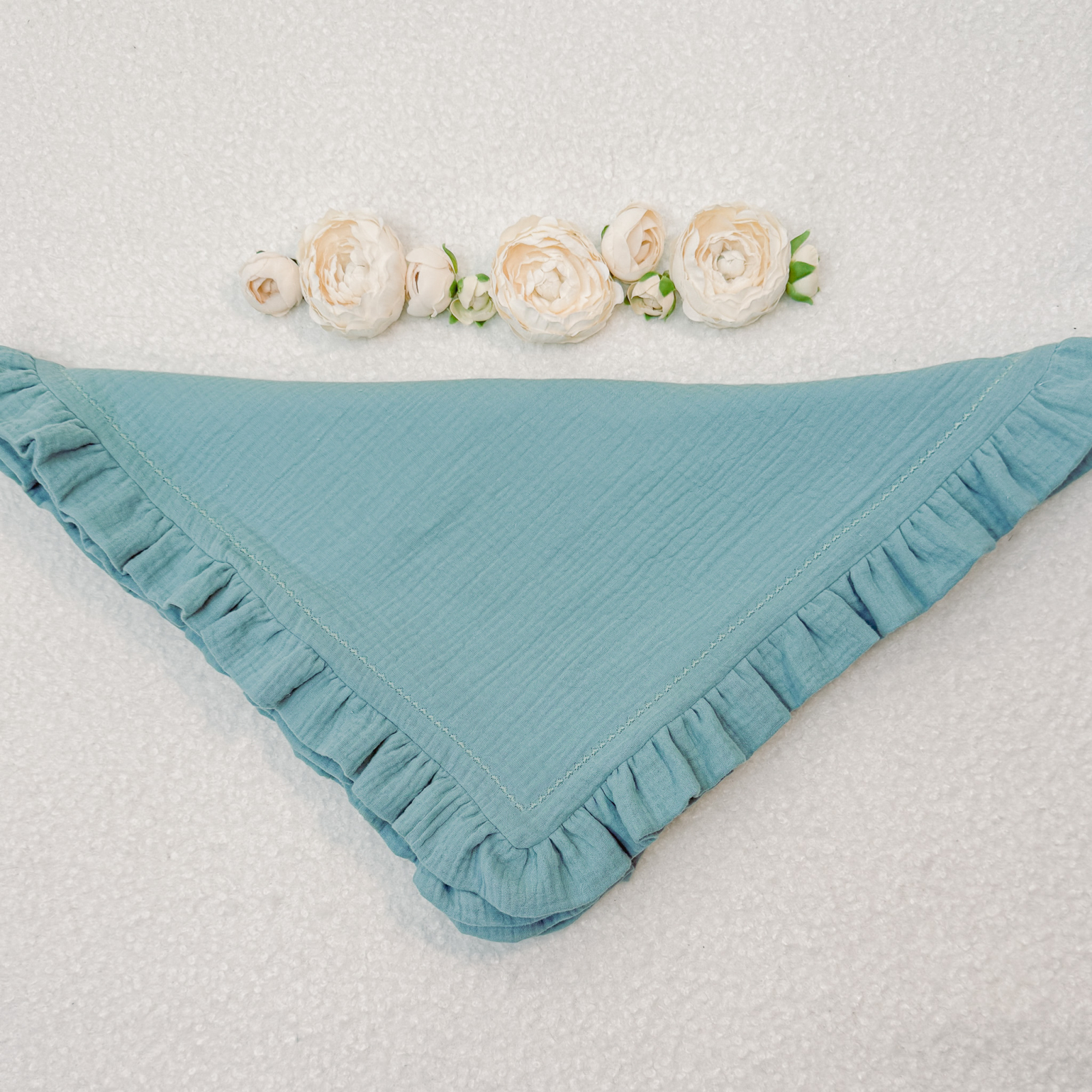 Caciulita din muselina moale, potrivita pentru pielea delicata a copilasilor. Volanasul ii ofera un aer elegant si o face potrivita pentru orice moemnt din viata micutilor.