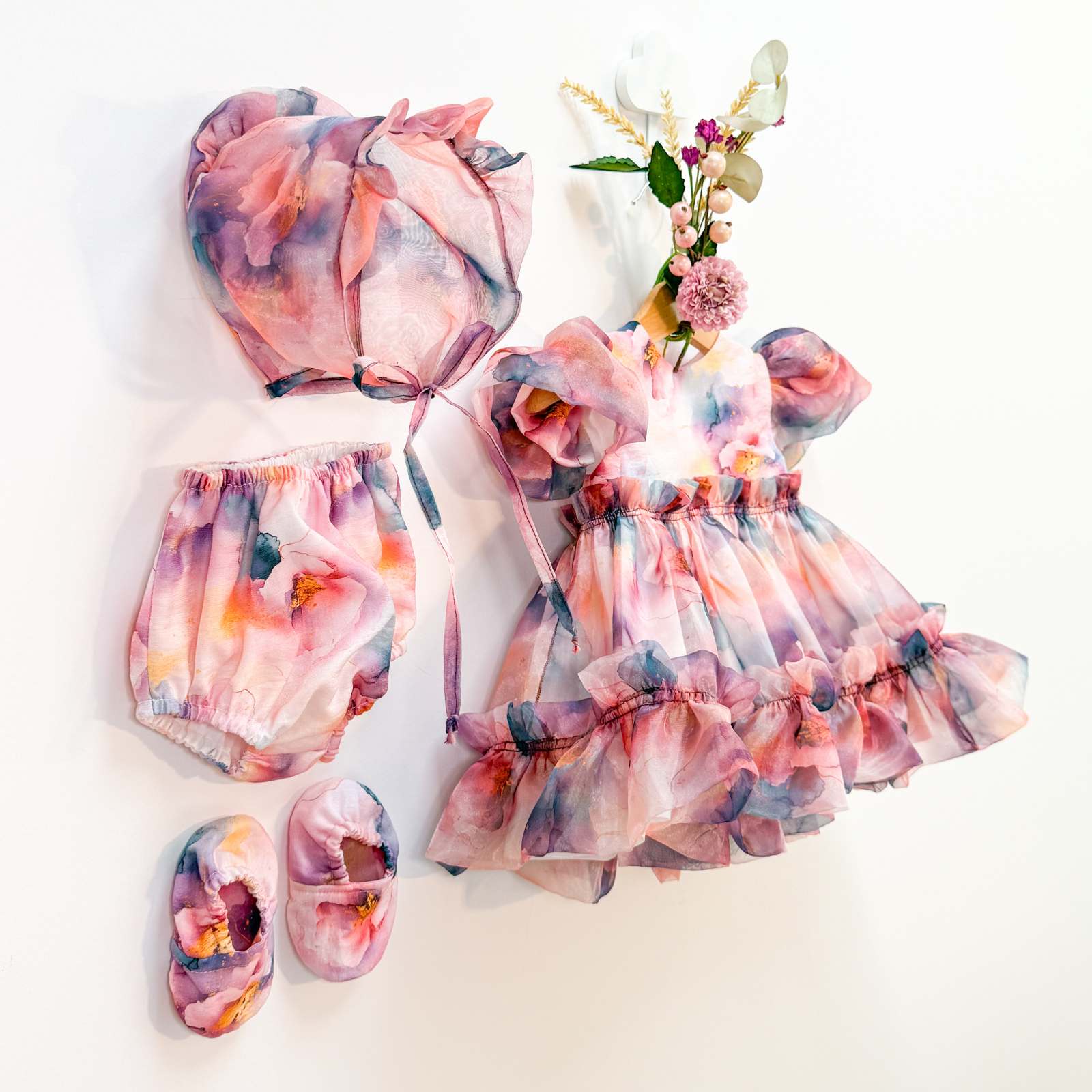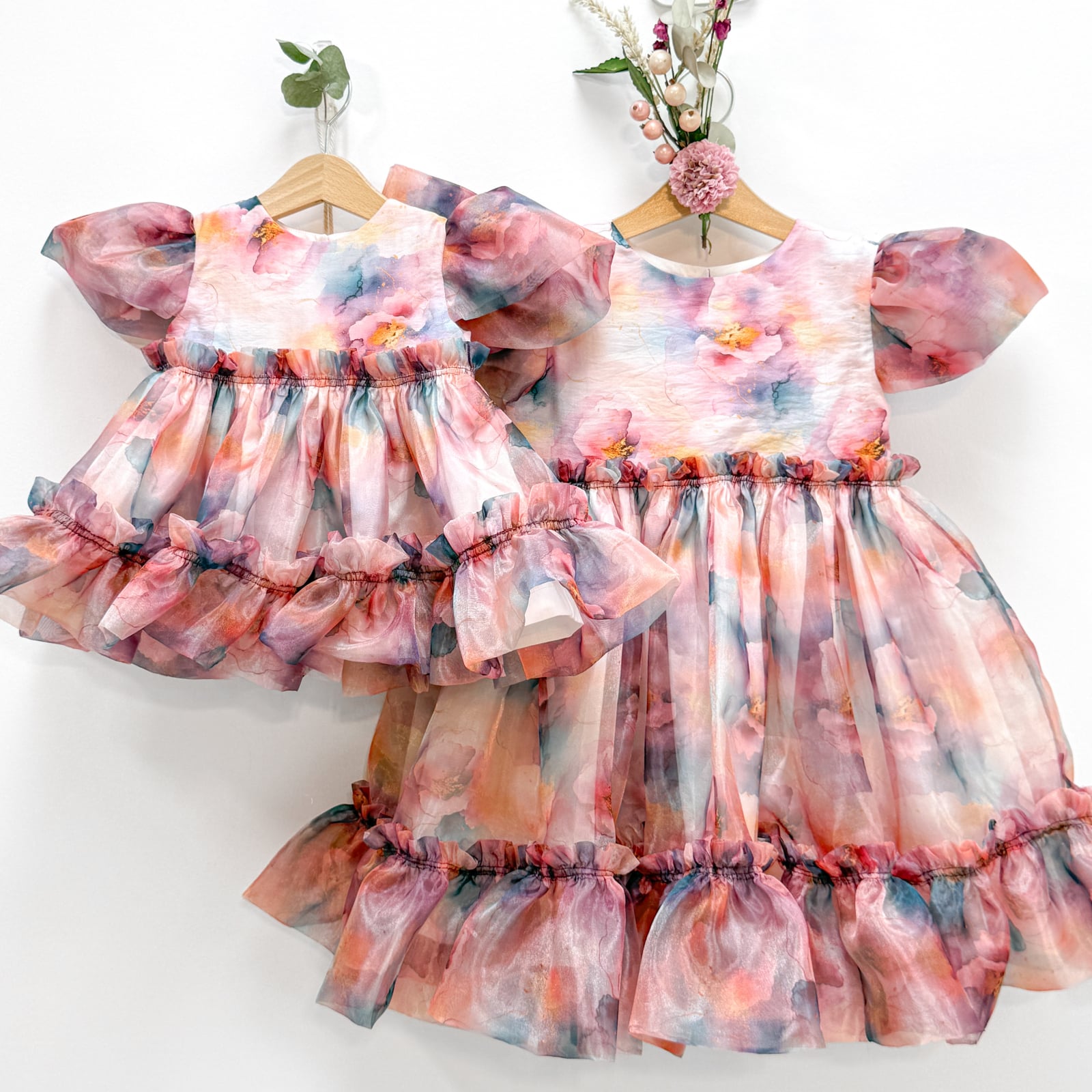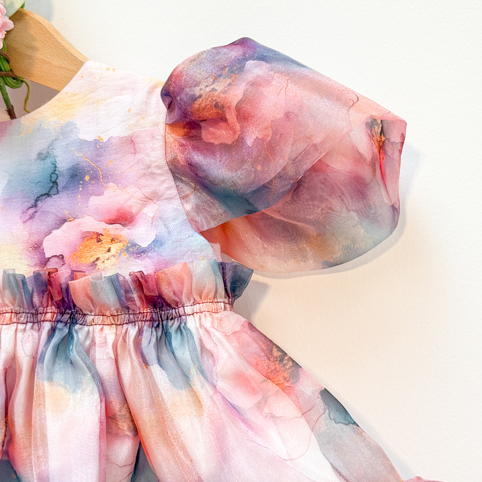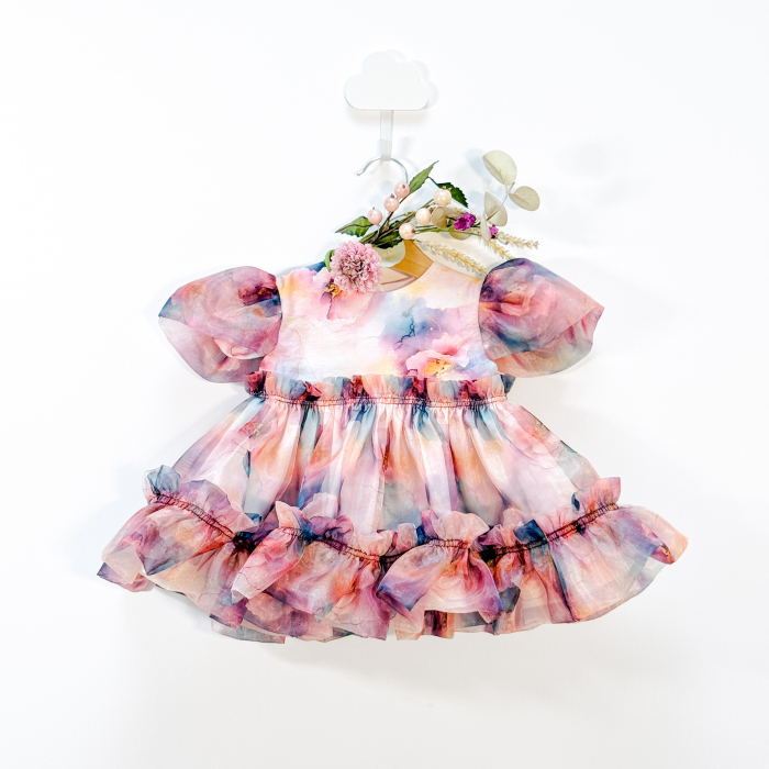 Rochita este realizata din vascoza satinata cu un luciu subtil si organza fina. Captuseala este bumbac 100% pentru confortul celor mici