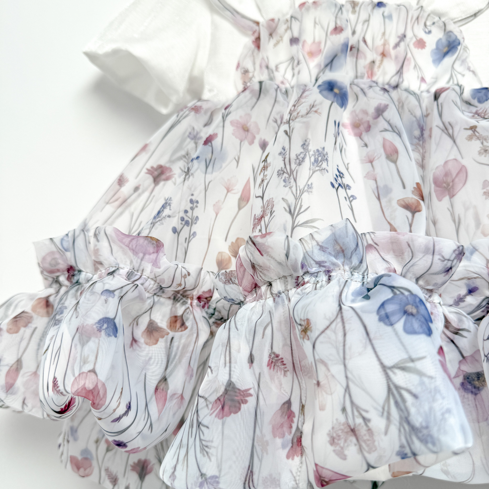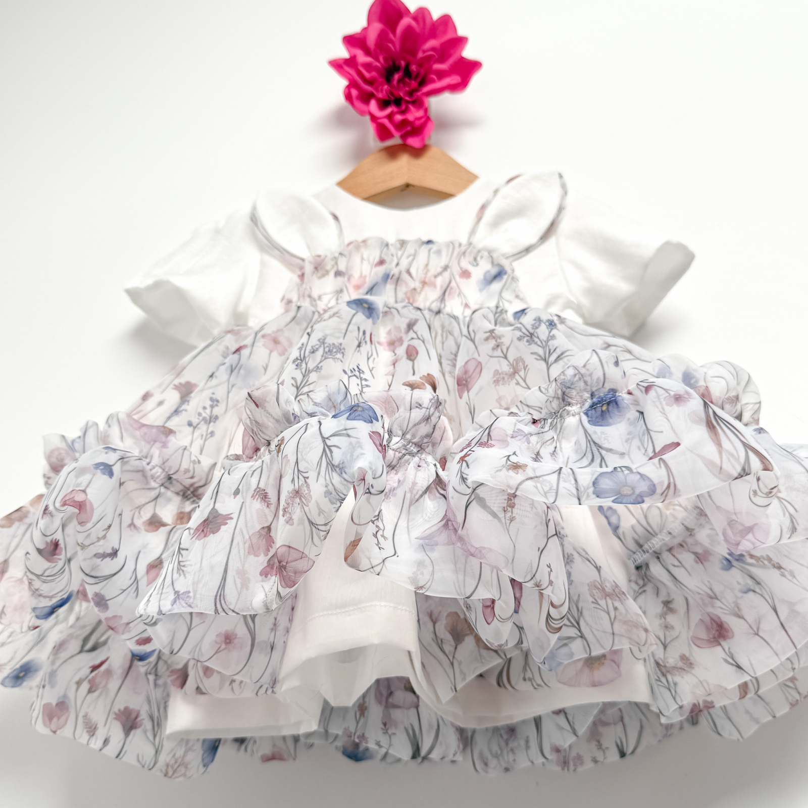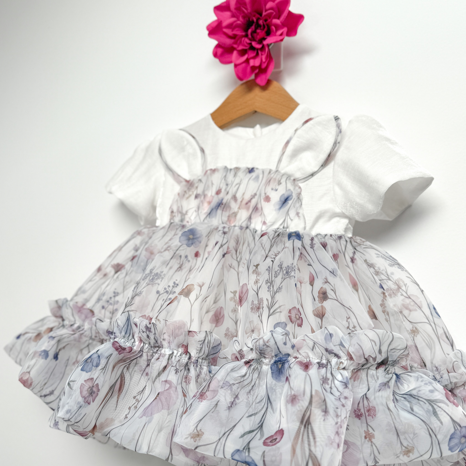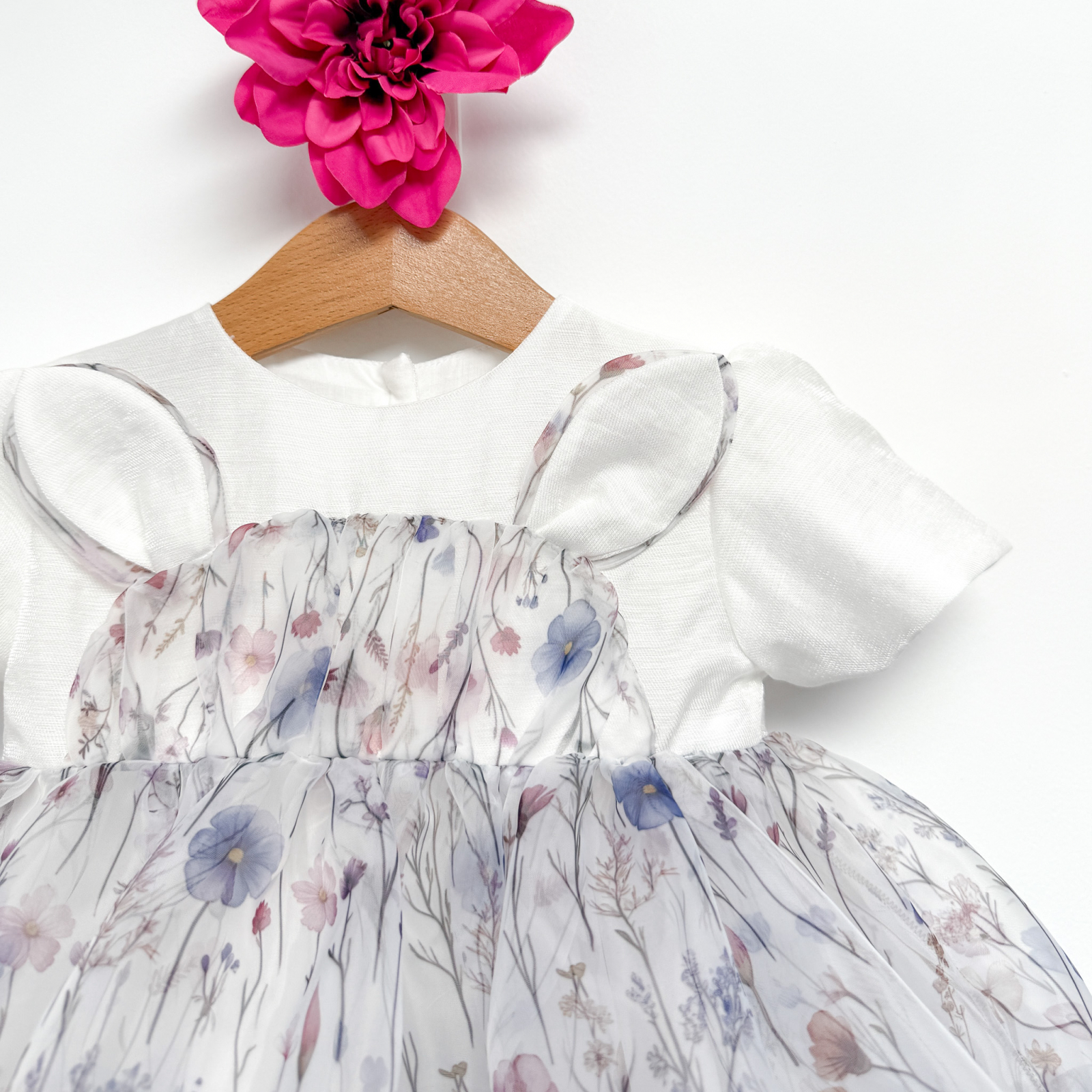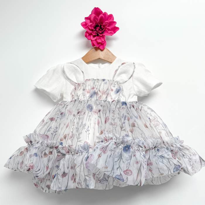 Rochita este realizata din vascoza satinata cu un luciu subtil si organza fina. Captuseala este bumbac 100% pentru confortul celor mici